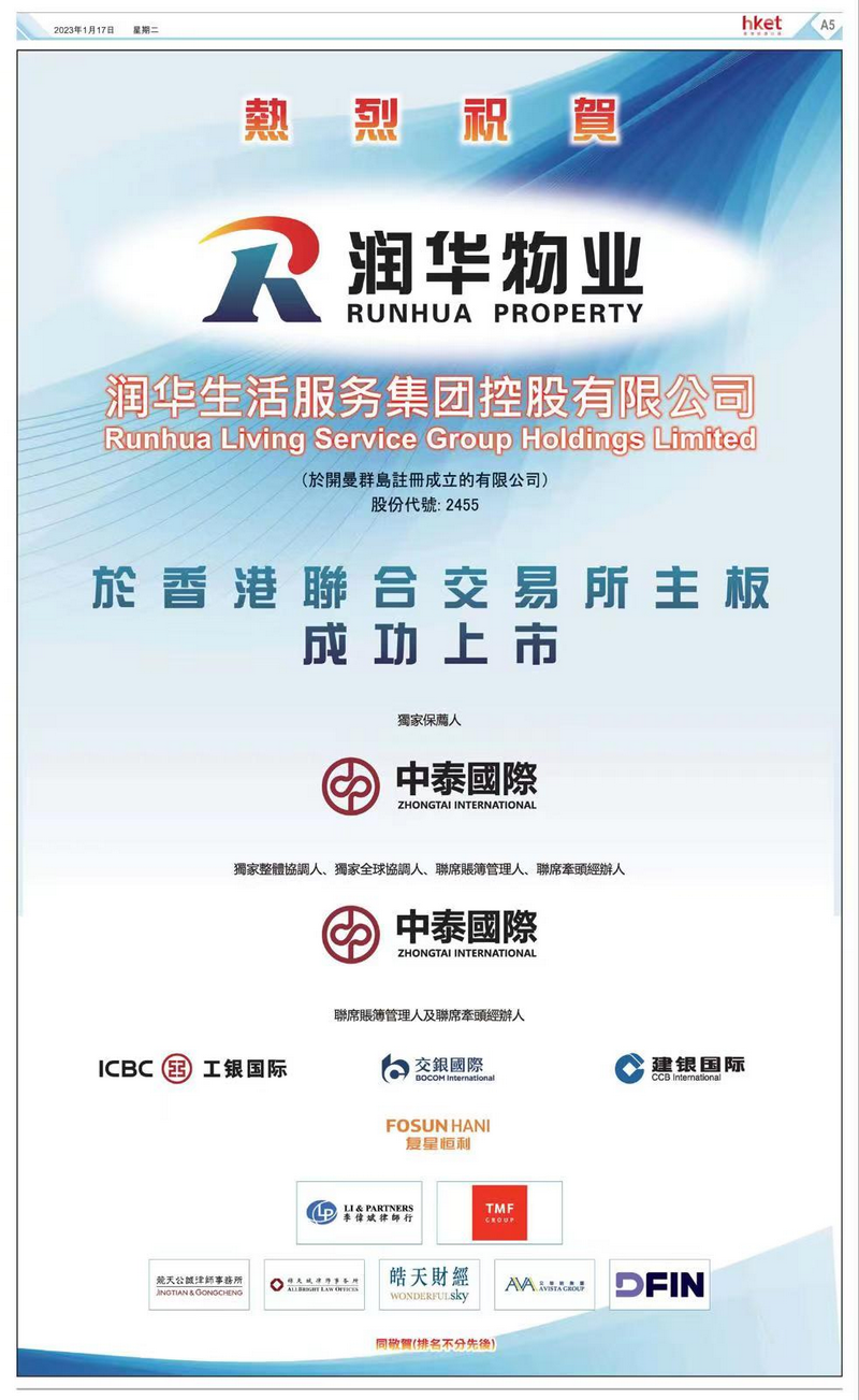 1月17日,润华生活服务集团控股有限公司(以下简称“润华服务”或“公司”,股份代号:02455.HK)在香港联合交易所有限公司主板正式挂牌上市。皓天财经非常荣幸担任润华服务的港股财经传讯顾问,助力公司成功上市,为该公司树立了卓越的企业形象,上市媒体及活动等方面的工作亦取得圆满成功!